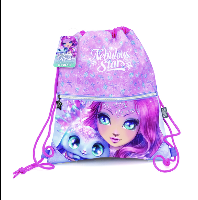 Nebulous Stars Vak s utahovacím provazem Cristalia. Velikost 41 cm. S přední kapsou na zip. Ideální na přenášení obuvi, nebo sportovního oblečení. 100% polyester. S motive Cristalie a Agathy.