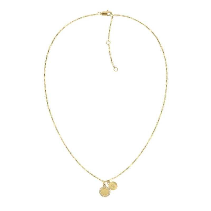Elegantní náhrdelník od značky Tommy Hilfiger je vyroben z kvalitní oceli a potažen zlatým PVD povlakem, což zajišťuje jeho dlouhou životnost a atraktivní vzhled. Dva přívěsky, jeden s jemnými čirými krystaly a vygravírovaným názvem značky, druhý s ikonickým logem, dodávají šperku unikátní šarm. Délka 40,6 cm s možností prodloužení o 5 cm a praktické zapínání na karabinku činí tento kousek ideálním doplňkem pro každodenní nošení i speciální příležitosti.