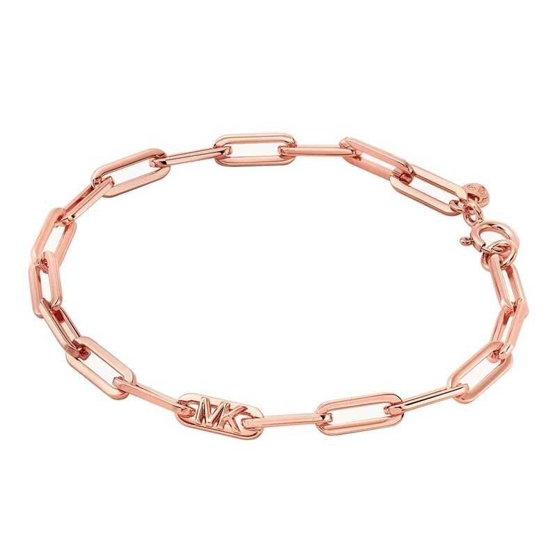 Nadčasový dámský náramek značky Michael Kors je symbolem elegance a vkusu. Vyroben ze sterlingového stříbra a pozlacený 14karátovým růžovým zlatem, náramek vyniká svým jedinečným designem, kdy jeden článek zdobí logo značky. S délkou 18 cm a bezpečnostním zapínáním na očko se snadno nosí a dokonale doplní každý outfit. Ozdobte své zápěstí šperkem, který zaujme na první pohled.