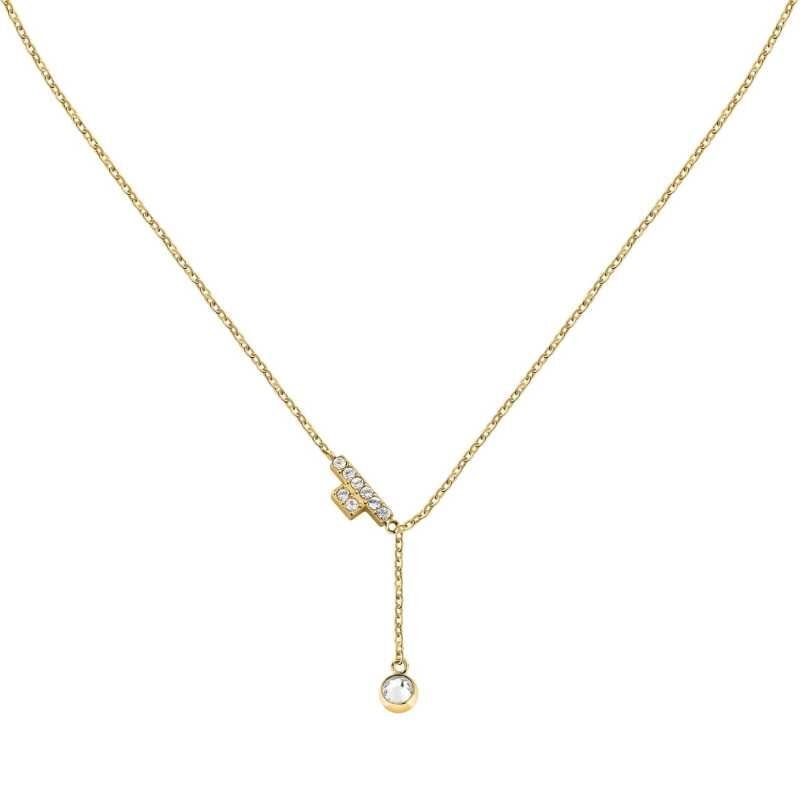 Elegantní náhrdelník značky Trussardi je ideálním doplňkem pro každou příležitost. Je vyroben z kvalitní oceli a pozlacení žlutým zlatem mu dodává nádech luxusu. Jemné broušené čiré krystaly přitahují pozornost a dodávají šperku jedinečný šarm. Délka 40 cm s možností prodloužení o 5 cm zajišťuje perfektní padnutí. Bezpečnostní zapínání na karabinku zaručuje pohodlné nošení. Vytvořte si nezapomenutelný vzhled s tímto půvabným náhrdelníkem.
