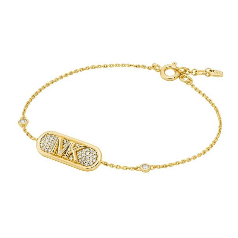 Dámský náramek značky Michael Kors spojuje luxus s nadčasovým stylem. Vyrobený ze sterlingového stříbra a pozlacený 14karátovým žlutým zlatem, nabízí elegantní design s dominantní ozdobou zdobenou logem značky. Čiré kubické zirkony dodávají náramku oslnivý třpyt, zatímco bezpečnostní zapínání zajišťuje pohodlí při nošení. S délkou 16,5 cm a možností prodloužení o 1,5 cm se stává ideálním doplňkem pro každou příležitost.