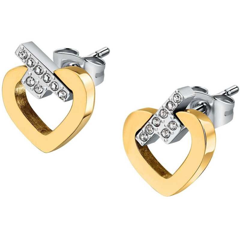 Elegantní náušnice pro ženy značky Trussardi přinášejí jedinečný styl a šarm. Vyrobené z kvalitní oceli, jejich design ve tvaru srdce s logem značky je pokrytý zlatým PVD povlakem, což zajišťuje nejen krásný vzhled, ale i trvanlivost. Ozdobné čiré zirkony dodávají náušnicím jiskru, zatímco bezpečnostní zapínání na puzetku zajistí pohodlné nošení. Ideální doplněk pro každý outfit.