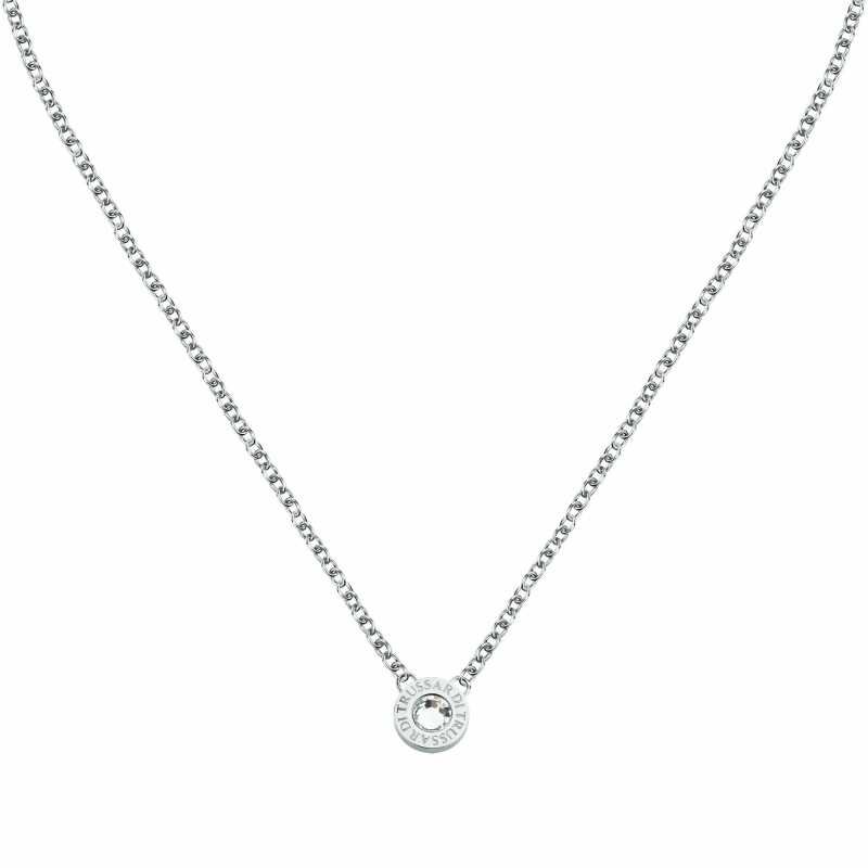 Elegantní dámský náhrdelník značky Trussardi přináší spojení kvalitní oceli a stylového designu. Jeho hlavním prvkem je kruhová ozdoba, která je osazena čirým krystalem a nese vygravírovaný název značky. Délka náhrdelníku činí 40 cm, s možností prodloužení o 5 cm pro dokonalé přizpůsobení. Díky jednoduchému zapínání na karabinku se snadno nosí a stává se ideálním doplňkem pro každou příležitost.