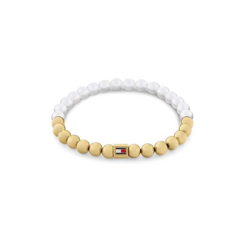 Dámský náramek značky Tommy Hilfiger spojuje eleganci a moderní design. Syntetické perly ladně kontrastují s korálky z nerezové oceli, které jsou pokryté zlatým PVD povlakem, čímž dodávají šperku na luxusním vzhledu. Náramek s logem značky má průměr korálků 0,6 cm a délku 16,5 cm. Tento stylový doplněk dokonale ozdobí vaše zápěstí a podtrhne váš osobitý styl.