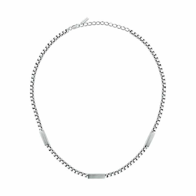 Elegantní náhrdelník značky Trussardi, vytvořený z vysoce kvalitní oceli, přináší spojení moderního designu a funkčnosti. Matně broušené prvky dodávají šperku sofistikovaný vzhled, zatímco logo značky na konci adjusty podtrhuje jeho jedinečnost. S délkou 50 cm a možností prodloužení o 5 cm je ideální pro každodenní nošení. Bezpečnostní zapínání na karabinku zajišťuje pohodlí a ochranu před ztrátou. Tento šperk zvýrazní váš styl a dodá šmrnc každému outfitu.