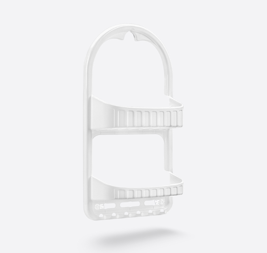 Dvoupatrová plastová police s háčky na zavěšení, určena k montáži na stěnu nebo pomocí přísavek. Rozměry 27 x 12 x 50 cm (Š x H x V). EAN číst celé