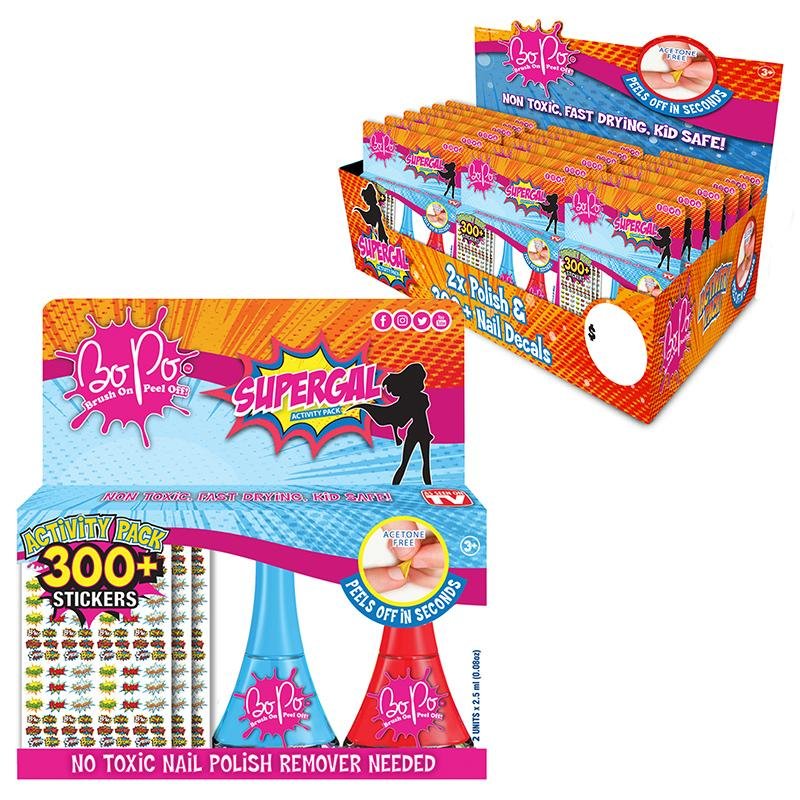 Revoluce ve světě manikúry. Již žádný odlakovač! Naneste lak, nechejte ho zaschnout a užívejte si krásné nehty. Chcete změnit styl? Chcete si užít další zářivou barvu? Jednoduše lak ze svého nehtu sloupněte a hned můžete lakovat znovu. Pozor. NOVINKA! Nyní si užijte Bo-Po laky s úžasnými vůněmi. Tyto laky jsou zdravotně nezávadné, šetrné k dětským nehtíkům a neobsahují acetylen. Lahvička je navržena tak, že se nevylije. Pro děti od 3 let.
