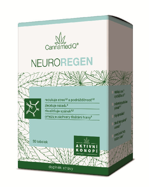 CannamediQ® Neuroregen je jedinečný přípravek s konopím, L-trytofanem, kozlíkem, meduňkou a bacopou modulující nervové obtíže ve 3 směrech. Unikátní kombinace kozlíku s bacopou podporuje psychickou pohodu a redukuje stres, obsažená meduňka mírní podráždění, zlepšuje kvalitu spánku a usnadňuje usínání. Bacopa navíc podporuje prokrvení mozku, čímž efektivně omezuje záchvaty třeštění hlavy.