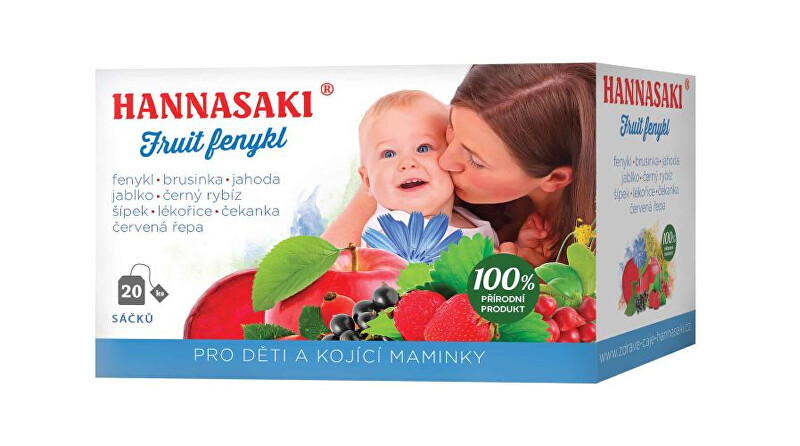 Hannasaki Fruit fenykl je vynikající čaj ze 100% přírodních surovin. Neobsahuje ibišek, který způsobuje pálení žáhy a je určený především dětem a kojícím ženám. Vynikající ovocná 100% přírodní směs podporuje celý organismus - ne jen pro děti a kojící ženy, ale i všechny dospělé. Obsahuje vitamíny, minerály, antioxidanty a stopové prvky. Podporuje tvorbu mateřského mléka předchází plynatosti a napomáhá odkašlávání malých dětí. Nemá žádné vedlejší účinky, není návykový, lze popíjet v průběhu celého dne.