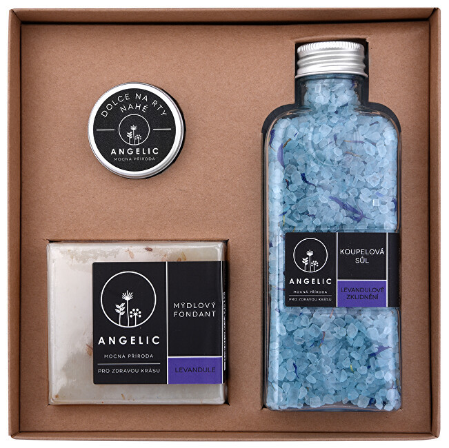 Dárková sada obsahuje: Koupelová sůl Levandulové zklidnění 260 gMýdlový fondant Levandule 105 gAngelic Dolce na rty Nahé 15 ml