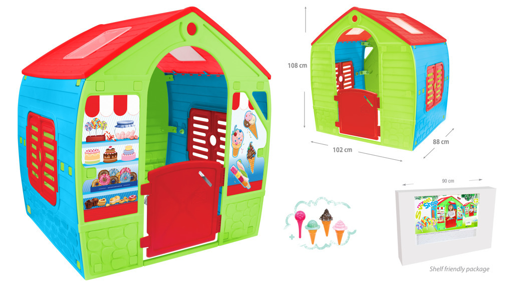 Zahradní domeček se zahrádkou. Domeček má zavírací dvěre a okna.Obsahuje příslušenství - kornouty se zmrzlinou a polepky. Velikostdomečku 102×88×120 cm. Vyrobeno z vysoce kvalitního plastu v EU.