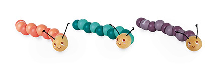 Displej obsahuje 12 ks kloubových housenek: 4 ks z každé barvy (růžová, zelená, fialová). Každým zvířátkem prochází guma a děti se tak budou bavit kroucením dílků všemi směry, aby vytvořily různé tvary. Prodávají se v displeji se zavěšeným štítkem na každém kusu. Vyrobeno z kvalitního dřeva. Vhodné pro děti: od 2 let Rozměr produktu: 17 x 2,8 x 2,8 cm Materiál: dřevo