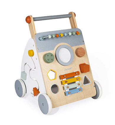 Toto atraktivní multifunkční chodítko je zvláště vhodné na učení se chůze. Bude bezpečně doprovázet děti od 12 měsíců: jeho neviditelná a odnímatelná brzda dokáže zajistit kola a postupně je uvolňovat, aby vaše dítě dokázalo zvládnout rychlost chodítka při učení. Kromě chůze bude vaše dítě moci vyzkoušet svou jemnou motoriku a šikovnost pomocí 9 nabízených zábavných aktivit: drátěná dráha - smyčkovací hlavolam, vkládání tvarů, bludiště, ozubená kola, knoflík na houkání, škrábání, zvětšující se rotující zrcadlo, buben a kovový xylofon stimulují hudební povědomí . Tento velmi šikovný produkt je vybaven plstěnou podložkou, která tlumí hluk a tlumí padající kostky. A nakonec jeho gumové kola jsou velmi tiché. Barva na vodní bázi. Vhodné pro děti od 1 roku Materiál: dřevo Rozměr produktu: 34,5 x 37 x 47,5 cm