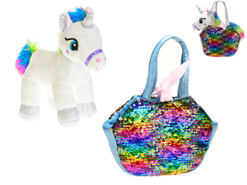 Jednorožec plyšový bílý 19cm s kabelkou s flitry 18x15cm