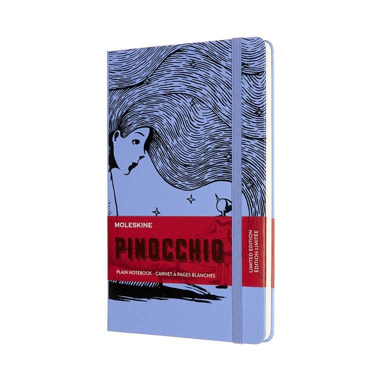 Čistý zápisník z limitované edice Pinocchio. Předsádka zápisníku je tematicky vyzdobena. Zápisník má pevnou, ve hřbetu šitou vazbu. Obepíná ho pružná páska proti samovolnému otevírání. Je vybaven praktickou vnitřní kapsou, která je vyrobena z tkaniny a kartonu, a textilní záložkou s letákem s historií Moleskine. Papír s gramáží 70 g/m2 neobsahuje kyseliny. Součástí zápisníku jsou samolepky a záložka.