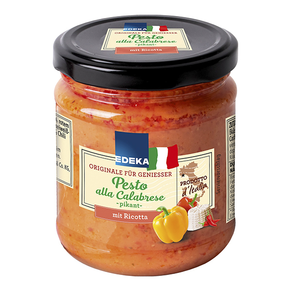 Pesto alla Calabrese - 190gr - NĚMECKO chutné pesto z paprik a sýru Ricotta. Obsahuje také kešu ořechy a sýr Grana Padano. Vhodné na těstoviny a nejrůznější studené předkrmy.Složení: Ćervená paprika, žlutá paprika , slunečnicový olej ,syrovátkový sýr ( Ricotta ) (SLADKÁ SYROVÁTKA, SMETANA, jedlá sůl, kyselina mléčná), KEŠU JÁDRA,GRANA PADANO,( MLÉKO, jedlá sůl, syřidlo, konzervační činidlo: Lysozym (obsahuje VEJCE). Cukr, jedlá sůl ,2x koncentrovaný rajčatový protlak, kyselina: kyselina mléčná ; cibule , chilli , byliny. Minimální trvanlivost do: uvedeno na víčku. Po otevření skladujte v ledničce a ihned spotřebujte!Alergeny jsou zvýrazněny velkým písmem.VÝŽIVOVÉ ÚDAJE/JEDNOTKA na 100g výrobku: energetická hodnota 100g: 1197KJ/290kcal, tuky 26g, z toho nasycené mastné kyseliny 4g, sacharidy 7,9g, z toho cukry 6,7g, bílkoviny 4,6,g, sůl 1,7g