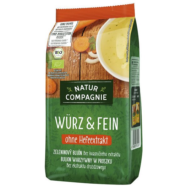 Natur Compagnie BIO zeleninový vývar bz kvasničného extraktu a bez přidaných cukrů - 252gkvalitní BIO certifikovaný zeleninový vývar na 12,6l hotového vývaru. Tento zeleninový bujón je bez přidaných cukrů a hlavně bez kvasničných extraktů. Jemně kořeněný vývar z řady Würz und Fein.Použití: 1 čajová lžička na 250ml vody. Celé balení vývaru je na 12,6l hotového bujónu.Tento kvalitní BIO německý vývar je vyráběn z vývaru: mrkev, cibule, pastiňák, petržel, bobkový list, libeček, kurkuma, zázvor, muškátový květ, pepř, slunečnicový olej a mořská sůl. Produkty jsou z konrolovaného ekologického hospodářství. Kontrolováno v Německu DE-ÖKO-001Může obsahovat stopy mléka, lepku, sóji, hořčice, celeru a vajec.