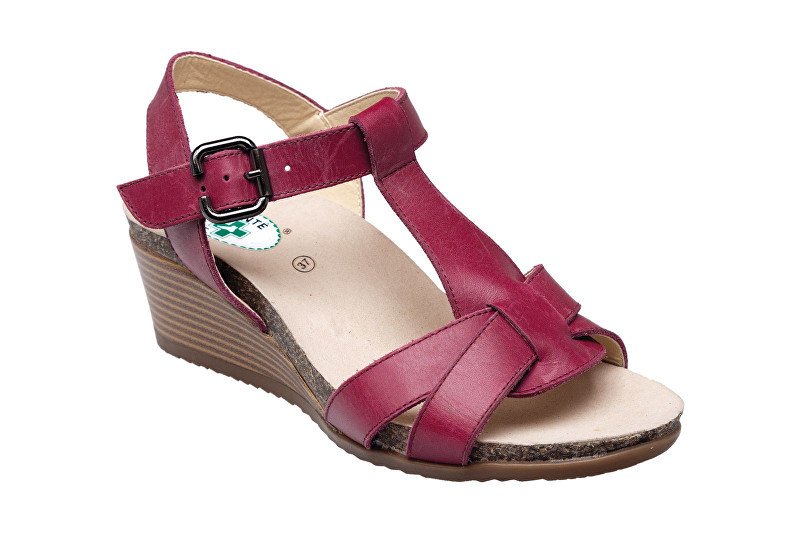 Zdravotní obuv - dámské vycházkové sandále,barva: vínová, podrážka: béžová,svrchní materiál: kůže,stélka: kůže,klínek cca 5,5 cm,pásek kolem paty lze nastavit pomocí spony,vpředu elegantní zkřížení kožených pásků. číst celé