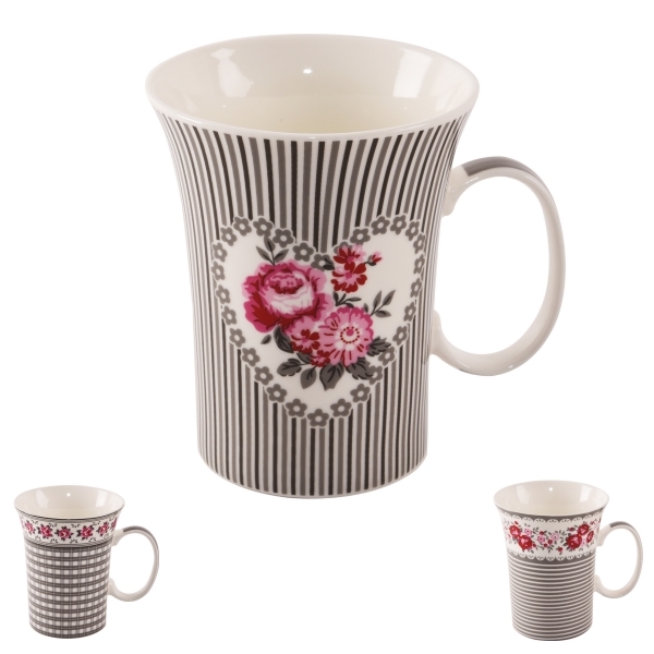 Hrnek s uchem. Materiál: porcelán. Dekor růžiček, assort dekorů. Rozměry: objem 0,36 l, pr. 9 cm, v. 11 cm.