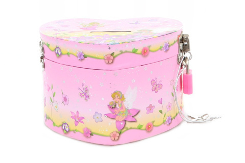 Pokladnička ve tvaru srdce s motivem víl. Součástí je také zámek a klíček. Rozměry cca 12,5 x 11,5 x 8,5 cm. Baleno ve fólii. Věk 3+ číst celé