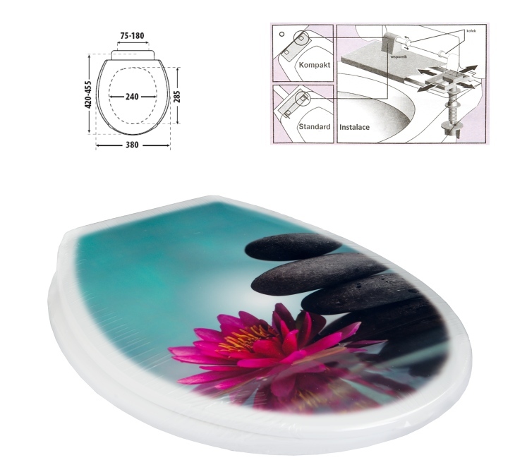 WC deska, sedátko nebo chcete-li prkénkno s krásným potiskem kameny vám zaručeně zpříjemní pobyt na toaletě. Sedátko je kompatibilní se širokou škálou standardních modelů toaletních mís od různých výrobců. Uchycení WC sedátka lze nastavit pomocí nastavitelných pantů. Materiál: kvalitní plast. Rozměry viz obrázek. V nabídce naleznete i další výrobky ve stejném designu.