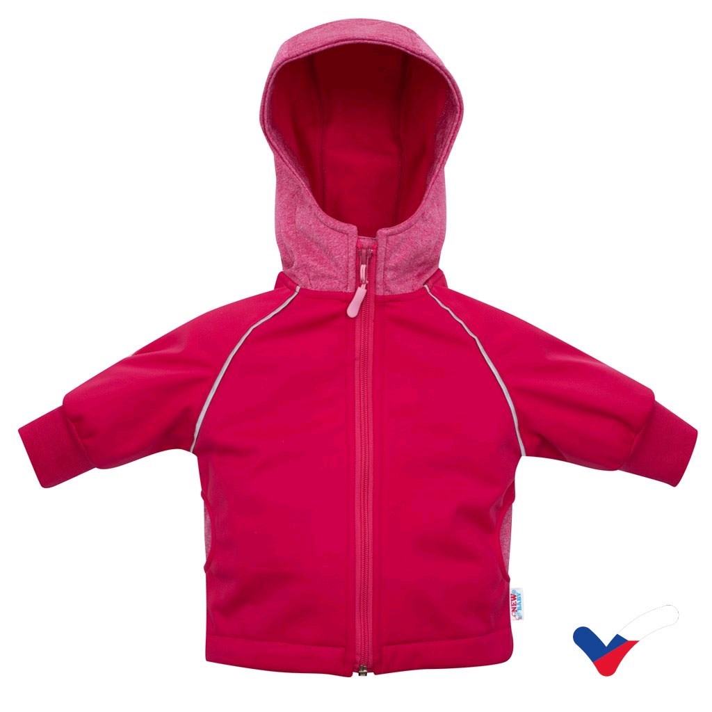Nápaditá softshellová kojenecká bundička New Baby. Bundička je vyrobena z kvalitního materiálu softshell. Materiál je hladký, elestický, měkký a příjemný na dotek. Do určitého stupně je také voděodolný, nenasakuje vodu a je odolný vůči znečištění. Praktické zapínání na zip po celé délce velmi usnadní oblékání a přebalování. Zip je po celé délce podšitý látkou, a tím je zamezeno profukování větru na pokožku miminka. Bunda má praktickou kapuci, širší pružné lemy na rukách a v pase a celá vnitřní strana je zateplená krátko střiženým polarem, který zvyšuje komfort nošení a zajišťuje teplo. Na rukávcích jsou našité reflexní paspulky. Softshellová bundička je vhodná jako sportovní oblečení, je odolná větru a zároveň prodyšná. Miminko se bude cítit velmi pohodlně a příjemně.