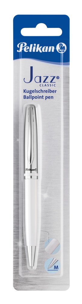 Jazz Classic, kovové s pochromovanou vrchní částí a perleťově bílou spodní částí těla, s kovovým klipem, leskle lakované, náplň Pelikan 337 M modrá, na blistru