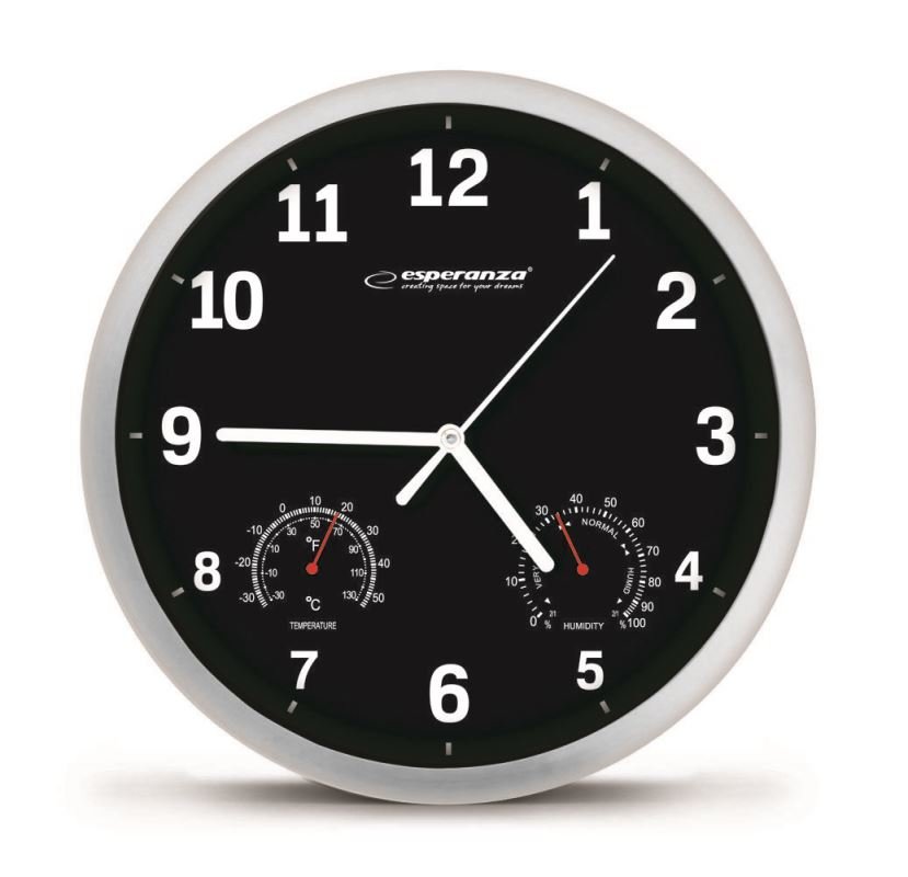Nástěnné hodiny Esperanza Lyon neukazují pouze čas, ale i teplotu a vlhkost ovzduší v místnosti. Teplotu měří od -30 ° C ~ + 50 ° C, vlhkost od 0 ~ 100%.Průměr: 25 cmŠířka: 3,6 cmMateriál: plast, papírNapájení pomocí jednou AA baterií (není součástí balení).