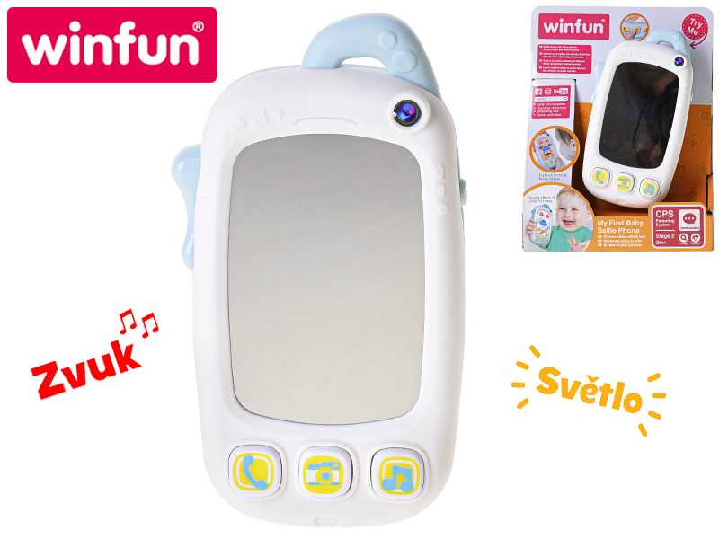 Telefon modrý 15,5cm na baterie se světlem, zvukem + animace 9m+ v krabičce