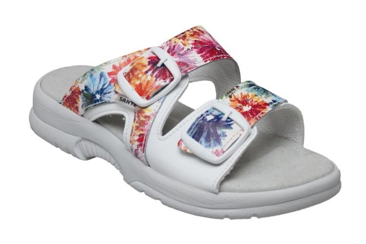 Zdravotní obuv - dámská pantofelBarva: BíláAnatomicky tvarovaná, měkčená stélkaMateriál stélky: useňNastavitelné svrchní pásky: přezky
