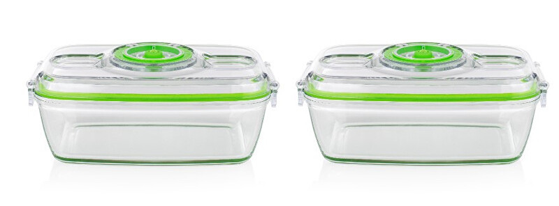 Praktická sada 2 ks skleněných dóz o objemu 1,1 l s možností vakuování (kompatibilní s vakuovačkou Princess 492985). Vakuová dóza zachová vaše potraviny a pokrmy déle čerstvé. Dózy jsou vhodné do trouby, mikrovlnné trouby i mrazáku. Víko je z BPA free plastu a disponuje silikonovým těsněním a datumovým kolečkem. Vhodné do myčky nádobí.