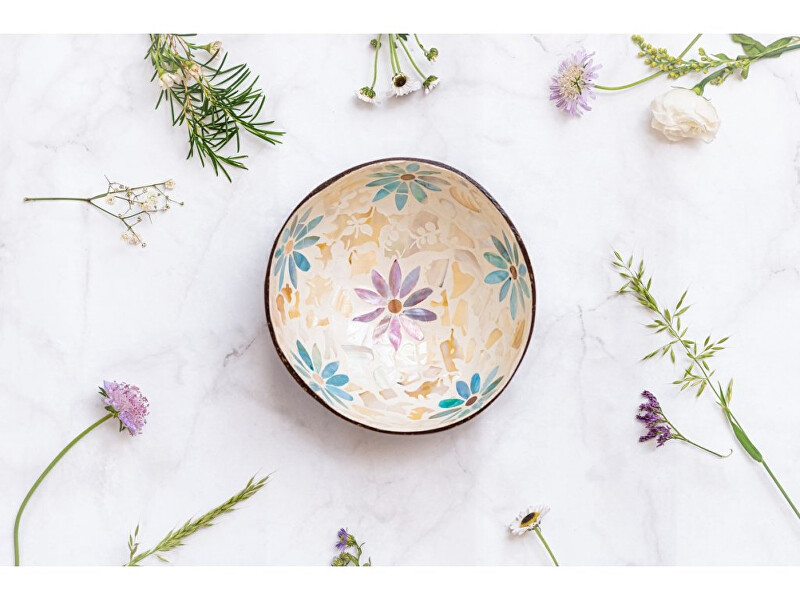 Tahle unikátní miska vznikla z obyčejné kokosové skořápky. Farmáři ve Vietnamu ji s láskou obrousili, vyleštili a opatřili lakovaným mozaikovým vzorem, který ji vtiskl punc exotiky. Miska je zdravotně nezávadná a určená pro přímý styk s potravinami. Má ráda pokojovou teplotu, nepatří do mikrovlnky ani lednice. Jednou za čas je potřeba ji natřít kokosovým olejem, vydrží pak dlouho krásně lesklá. Každá miska má trochu jinou velikost, tvar a barvu.