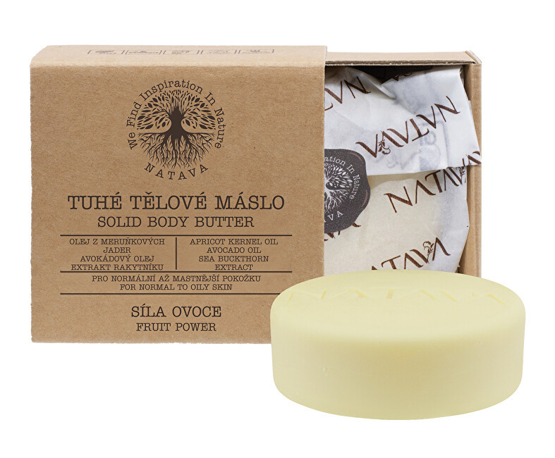 Tuhé tělové máslo Síla ovoce je vhodné pro normální až mastnější pokožku. Kombinace kakaového a bambuckého másla obohacená o lehký olej z meruňkových jader, avokádový olej a extrakt z rakytníku pomáhá udržet pokožku hydratovanou a vyživenou. Tělové máslo poskytne Vaší pokožce blahodárnou péči, uvolnění a relaxaci, zanechává příjemný pocit a jemnou vůni.