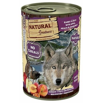 Natural Greatness králík, kachna, jablka, broskve, konzerva pro psy 400 g