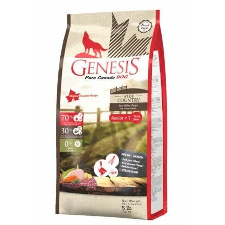 Genesis Pure Canada Wide Country je krmivo zaměřené na specifické potřeby vašeho staršího psa (7 let a starší). Speciální receptura složená ze 70 % bílkovin z čerstvého husího, bažantího, kachního a kuřecího masa zajistí udržení životního stylu vašeho staršího domácího mazlíčka.