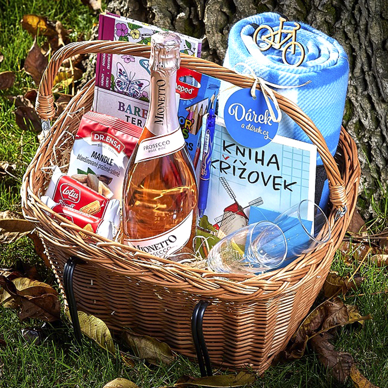 Vše zabaleno v proutěném koši na kolo.