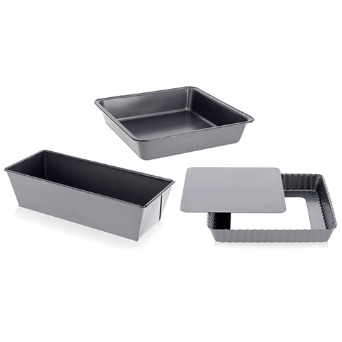 Sada na pečení de Buyer, 4713.03, box HOMEBAKING: hranaté formy, 1x skládaná čtvercová, 1x čtvercová a 1x obdélníková forma