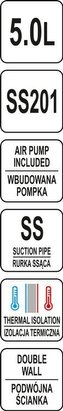 Termoska je vybavena čerpadlem, které usnadňuje přesné nalévání nápojů. Na druhé straně je sací trubice vyrobena z nerezové oceli, což umožňuje udržovat ji bezvadně čistou bez nadměrného úsilí. Termoska YATO je také vybavena ochranou proti odkapávání, která zabraňuje rozlití nápojů. Praktická plastová rukojeť usnadňuje přepravu termosky.