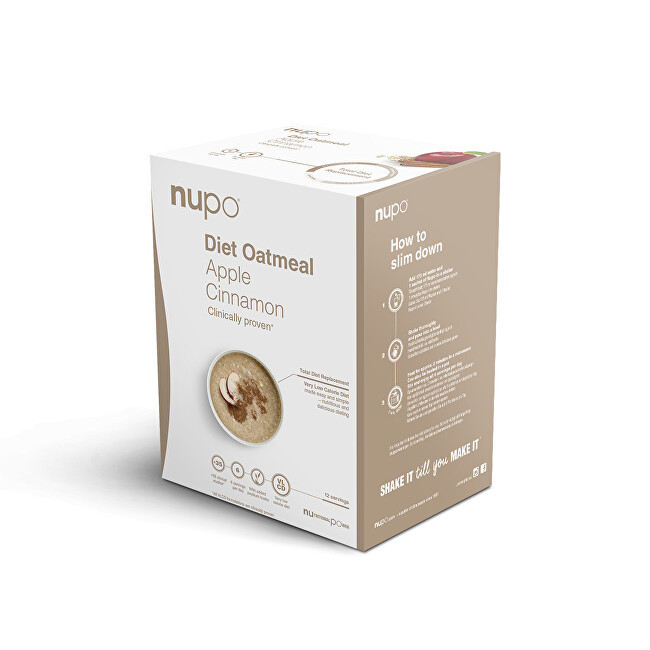 NUPO kaše v prášku s příchutí Jablko Skořice. NUPO je nízkokalorický program pro redukci hmotnosti, který vás rychle a zdravě dostane do skvělé formy. Tato dánská dieta obsahuje všechny složky vyvážené stravy (bílkoviny, sacharidy, vitamíny a minerály) namíchané tak, abyste efektivně zhubli a nedostavil se jojo efekt. Díky jeho skvělé chuti nestrádají ani vaše chuťové buňky a vysoký obsah vlákniny zase zabraňuje pocitu hladu, který byste při šesti porcích denně mít neměli. S NUPEM nemusíte nic vážit či počítat kalorie. Vše je již připraveno. NUPO je baleno po jednotlivých porcích, umožňuje vám tedy vzít si ho pohodlně kamkoli s sebou. K jeho přípravě potřebujete pouze šejkr a vodu.