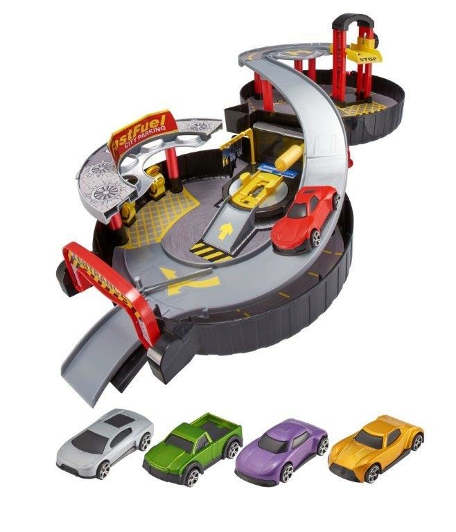 Garáž v kufříku podobném pneumatice. Obsahuje 5 autíček, spojovací rampy, myčku, čerpadla a další.
