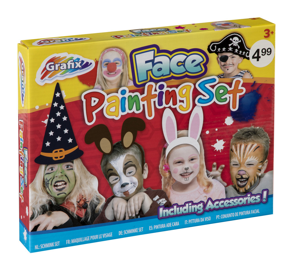 Sada barvy na obličej s příslušentví obshuje - 7 různých baredv na obličej, 2 štětce, 4 tužky na obličej, dva kelímky s třpytkami, šaškovský nos, houbičky na aplikaci, vystřihovací čepice, pirátskou pátsku přes oko a další. Splňuje normy EU, zdravotně nezávadné.