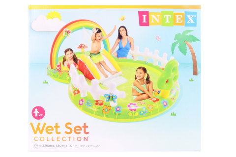 Nafukovací centrum v designu zahrádky o velikosti 2,90 m x 1,80 m x 1,04 m. Hubice na vodní rozstřikovač. Výrobek obsahuje skluzavku a další herní prvky- 2 nafukovací houbičky, 4 motýlci a 3 míče. Součástí výrobku je také jedna nafukovací podložka navíc. Vypouštěcí zátka ve dně bazénu. Kapacita bazénku je 450 litrů a výška stěny je 13 cm. Maximální nosnost je 54 kg. Součástí balení je opravná záplata. Vhodné pro děti od 2 let.