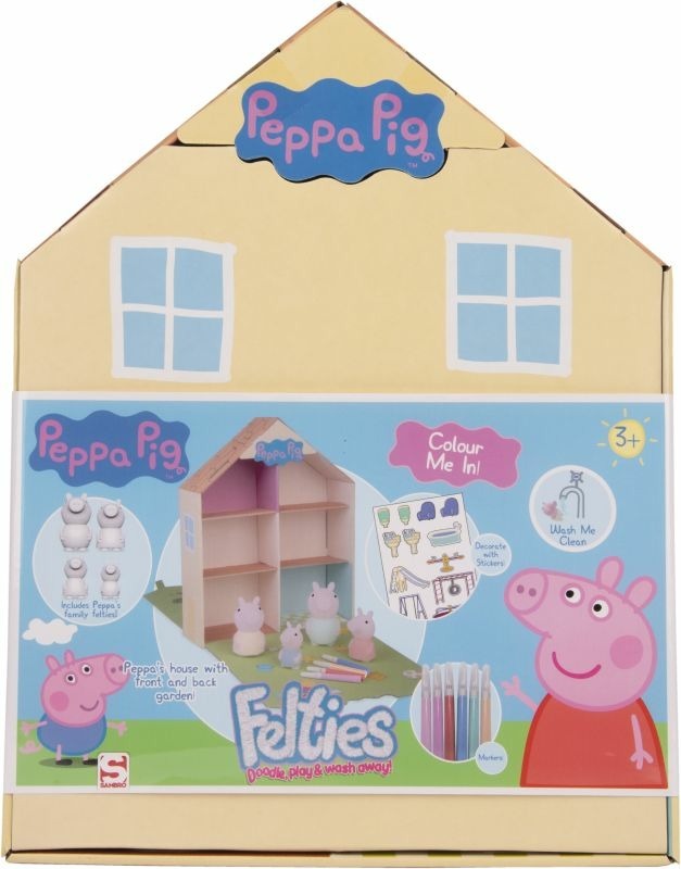 S touto zábavnou omalovánkou si děti mohou vytvořit vlastní herní sadu ve tvaru domečku prasátka Peppa. Nalepte samolepky a ozdobte dům, abyste z něj vytvořili krásný domeček, poté vybarvěte figurky z plsti, figurky lzeprát v pračce a můžete barvit znovu a znovu. Balení obsahuje pltěné firgurky Peppa, George, Daddy a Mummy + papírový domeček, 6 barevných fixek a samolepky.
