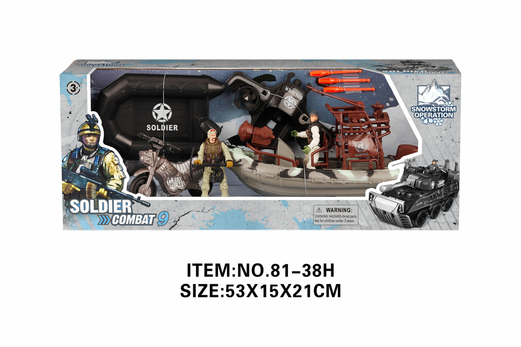 Vojenská sada pro malé vojáky. Tato sada obsahuje vojenskou loď, figurky, motorku a další doplňky. Vhodné pro děti od 3 let.