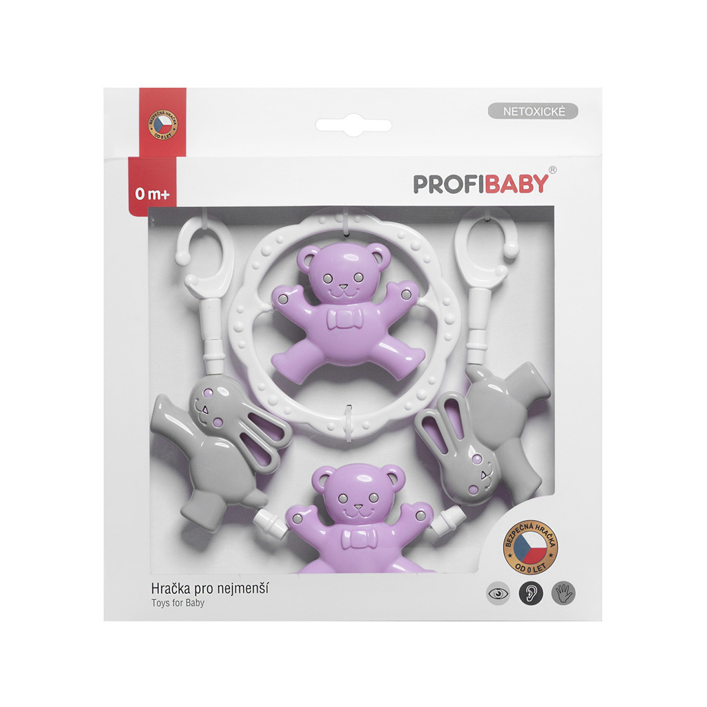 Souprava chrastítko řetěz na kočárek +chrastíko medvídek šedo/růžové, šedo zelené, šedo/bílé nebo pestrobarevné. V odzdobné krabičce. Vyrobeno v ČR, splňuje hygienické normy EU.