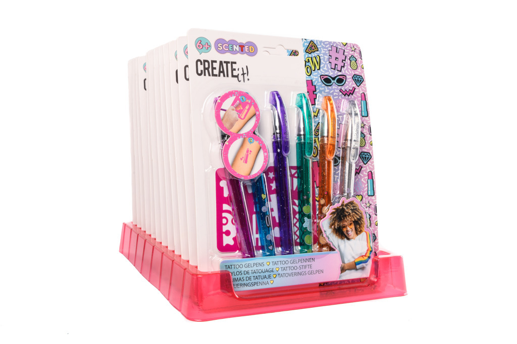 Tetovací sada v šesti barvách - růžové, modré, fialové, zelené, oranžové a stříbrné. Sada obsahuje voňavá tetovací pera a šablony. Dermatologicky testováno v EU, zdravotně nezávadné.