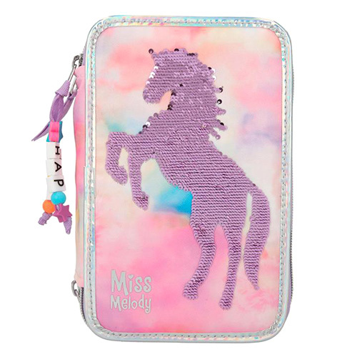 Praktický třípatrový školní penál vyrobený z kvalitního materiálu odolného proti běžnému opotřebení. Jedinečná náplň penálu nabízí - 2 tužky, 18 pastelek, 18 fixů, nůžky, lepidlo, pravítko, ořezávátko, gumu a kapsičku.Penál nabízí dostatečný vnitřní prostor postačující potřebám mladších i starších školaček.Spolehlivé bezporuchové zapínání na zip a originální stylový design značky Miss Melody vytvořily z tohoto penálu oblíbenou školní pomůcku.Materiálové složení: 100% polyester.Rozměry penálu: 20 x 13 x 7,5 cm.Vhodné pro dětiod 3 let.