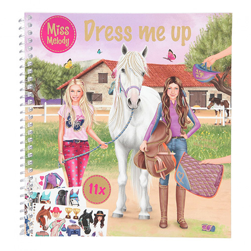 Oblíbený kreativní sešit v pevných deskách v jedinečném designu značky Miss Melody. Desky obsahují 24 stránkový sešit s předkreslenými obrázky modelek a koní, které si můžete sami obléct! K dispozici jsou archy samolepek s nejrůznějším jezdeckým oblečením a doplňky pro koníky na dotvoření stylu podle Vašich představ. Kreativní sešit z mimořádně oblíbené kolekce Miss Melody si zamilují všechny milovnice koní!Rozměry: 18,5 x 17,5 x 1,5 cm.Vhodné pro děti od 5 let.