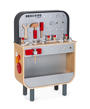 Dřevěná hračka pro děti ve věku 3 - 8 let. Rozkošný pracovní stůl vyrobený ze zakřiveného dřeva s oboustrannou hrací plochou! Přední strana: plně magnetický pracovní stůl s chytrým magnetickým systémem nářadí, který pomáhá dětem při správném skladování nářadí, a několik doplňků na vymýšlení předmětů, které se dají nekonečně sestavovat a rozebírat. Obsahuje 3 magnetické nástroje, 29 doplňků (dřevěné matice, šrouby a hřebíky, desky, křídy ...), svěrák, převodový systém a břidlici (na boku), na kterou se dá psát křídami. Veškeré příslušenství je uloženo na přední straně na místě k tomu určeném. Zadní strana: 4-dráhový závodní svah s 2 auty, které se střídají při sjezdu ze svahu otáčením válců a zvoněním zvonů! Chichot zaručen! Pro děti od: 3 let Materiál: dřevo Rozměr produktu: 55 x 29 x 77,5 cm