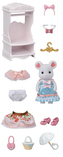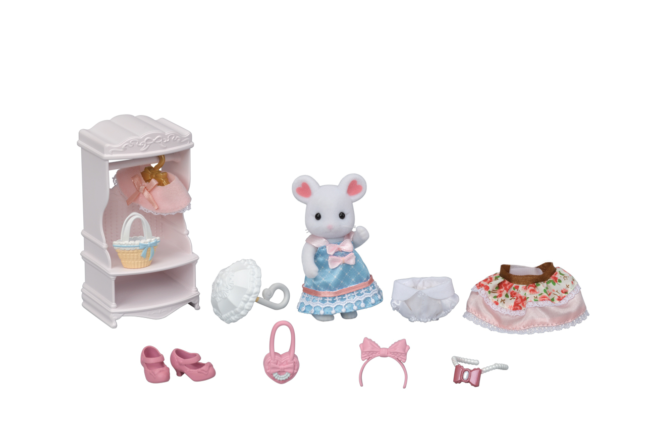 Stephanie Marshmallow, starší sestra Katherine a Christophera, je talentovaná návrhářka. Ráda se obléká do pastelových barev a zdobí své oblečení barevnými mašličkami a stužkami. Oblečení a doplňky je možné vystavit do stojanu na oblečení. Kombinujte sadu Módních oblečků a doplňků s Módním butikem (6013, prodejné samostatně) a s dalšími figurkami Sylvanian Families (prodávají se samostatně) a užijte si tak více zábavy při hře. Herní sady a figurky Sylvanian Families jsou nadčasové a vysoce kvalitní hračky. Hra podněcuje představivost dítěte. Figurky jsou vyrobeny z plastu, který je potažený jemňounkým sametem. Očička jsou z černých korálků. Všechny končetiny jsou pohyblivé a hlavička otáčecí. Oblečení je vyrobeno tak, aby se dalo opakovaně svlékat a oblékat. Výška figurky je 8 cm. Sada obsahuje: 1x figurka starší sestra myška Marshmallow, 1x halenka, 1x sukně, 1x plášť, 1x slunečník, 1x lodičky, 1x náhrdelník, 1x ramínko, 1x čelenka, 1x kabelka, 1x košík, 1x stojan na oblečení. Věk: 3+